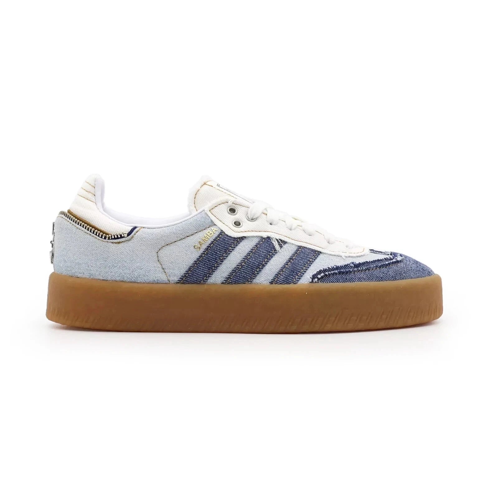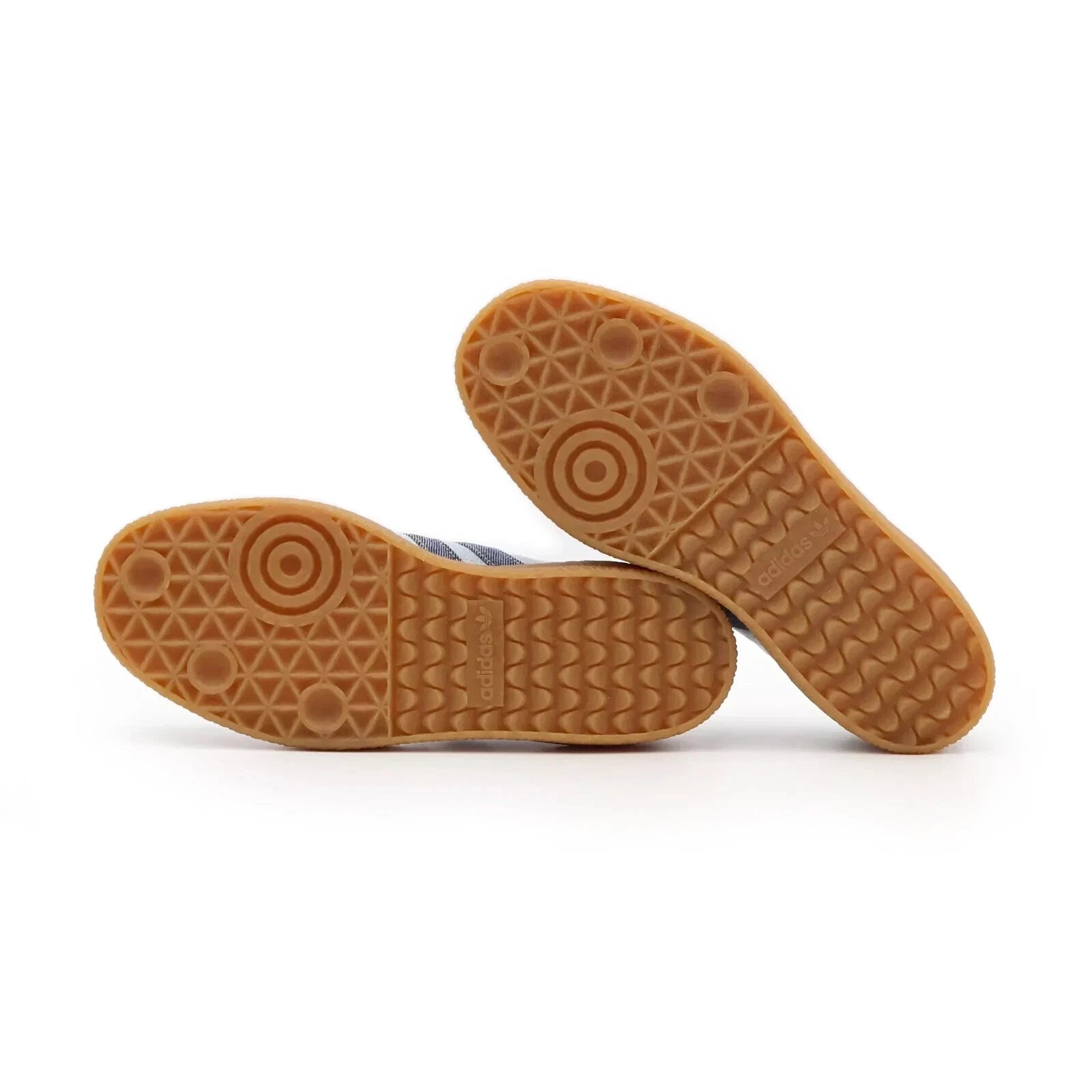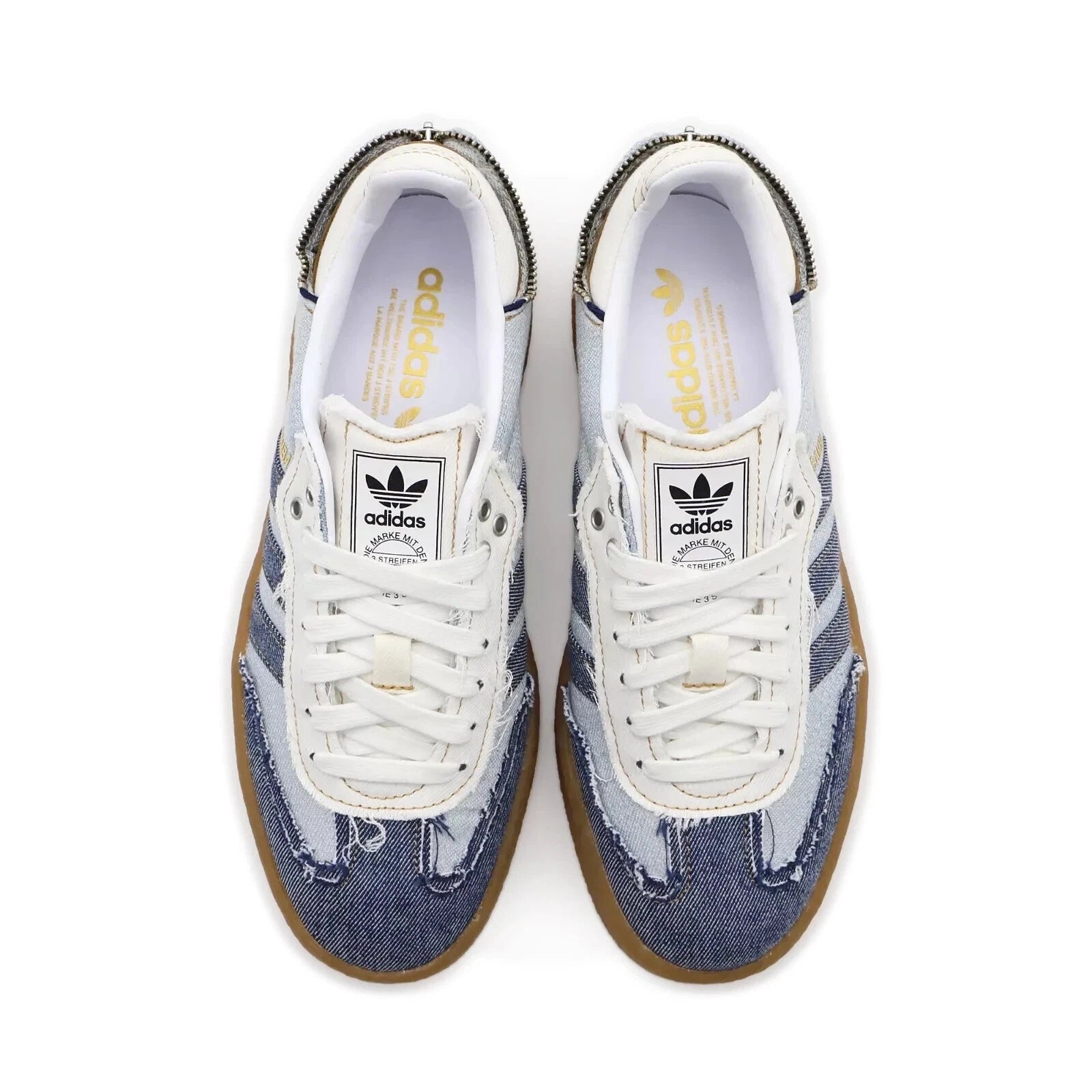 Classic sport style meets rugged streetwear in this inspired version of the Atmos x Sambae "Denim". Paying homage to vintage Americana, this bold reinterpretation of the iconic Samba silhouette features layered denim panels in contrasting washes, paired with frayed edges and gold stitching for that true worn-in feel.