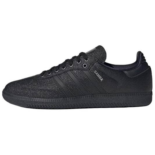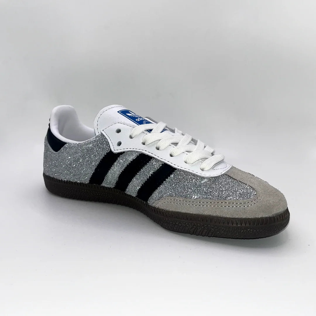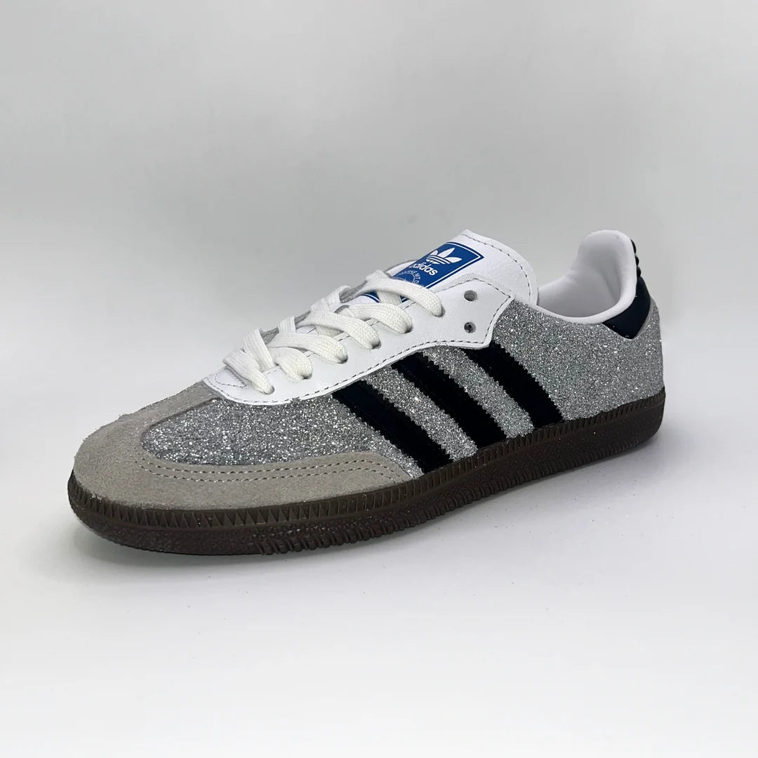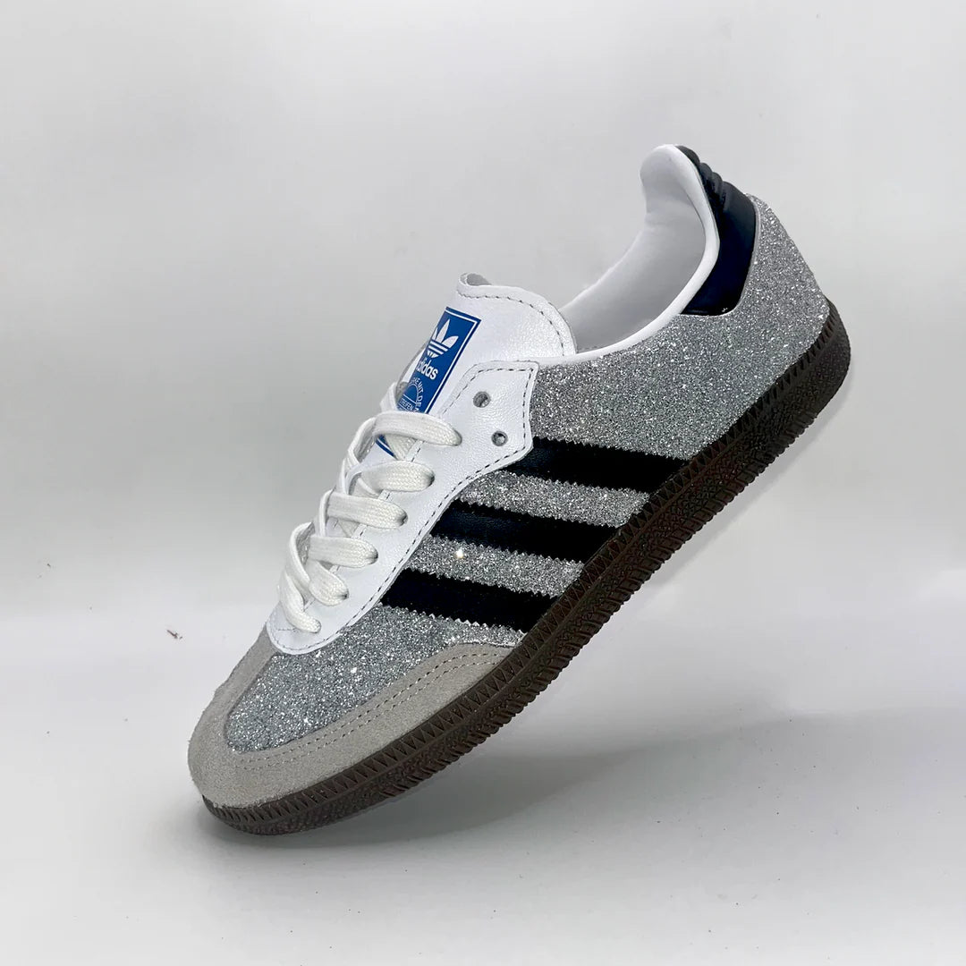 Born on indoor soccer fields, the Samba have evolved into a timeless lifestyle icon, blending sport and street culture with effortless style. This exclusive version stays true to the original silhouette while adding a refined touch — a black and silver glitter finish, delicately hand-stitched for a distinctive and elegant look.